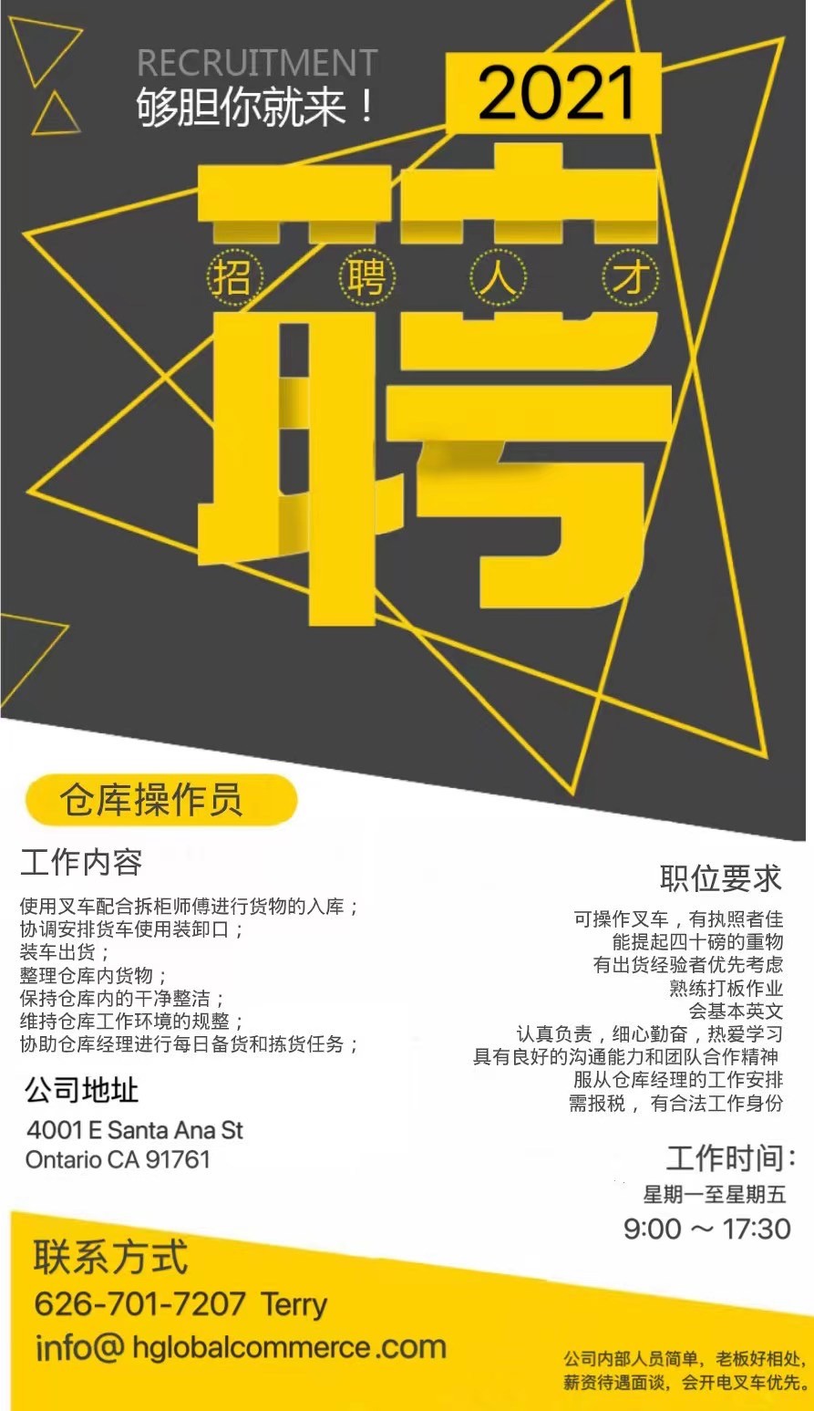 招聘职位:仓管员工作地点? Stafford St, City of Industry, CA 91744招聘全职仓管员3名工作内容:处